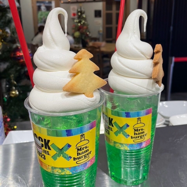 この〝ツリークッキー付きクリームソーダ🎄〟に〝ブラピスライダーバーガー🖤🩷〟を並べて持って、背景はクリスマス仕様のミセスハンバーガー🍔